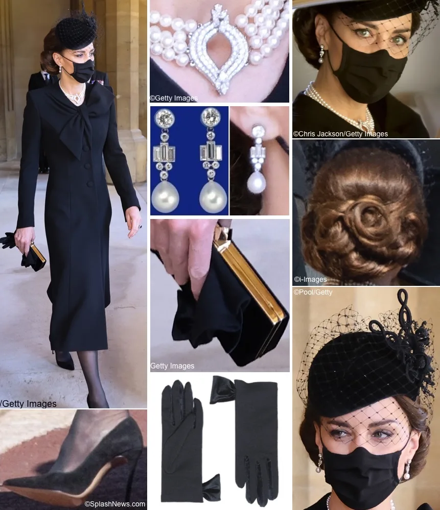 For the funeral of Prince Philip (funeral coverage here and fashion coverage here), the Duchess of Cambridge paired a new Catherine Walker coat with previously worn pieces. Her necklace and earrings were loaned items from The Queen, both with special sentimental significance. Kate previously wore the necklace for a private dinner at Windsor Castle in 2017 celebrating the Queen and Prince Philip’s 70th wedding anniversary. The Bahrain Pearl and Diamond Drop Earrings were made from stones that were a wedding gift to Princess Elizabeth and Lieutenant Philip Mountbatten in 1947.