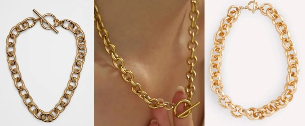 JUN 10: Here are some more options to repliKate the Laura Lombardi Portrait 14kt Gold-Plated Chain Necklace. On the left, the Toggle Chain Necklace ($35) as offered at Banana Republic Factory. Next, the NANA Huang Chunky Necklace ($16.99), as sold at Walmart. On the right, the Chunky Chain Necklace ($72), as stocked at Boden.